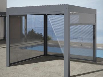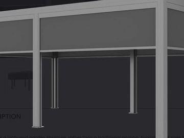 A 3.6m x 3.6m gazebo with LED lights on all 4 sides and across central bar, with a manually controlled louvred roof and built in fabric curtains on all four sides.